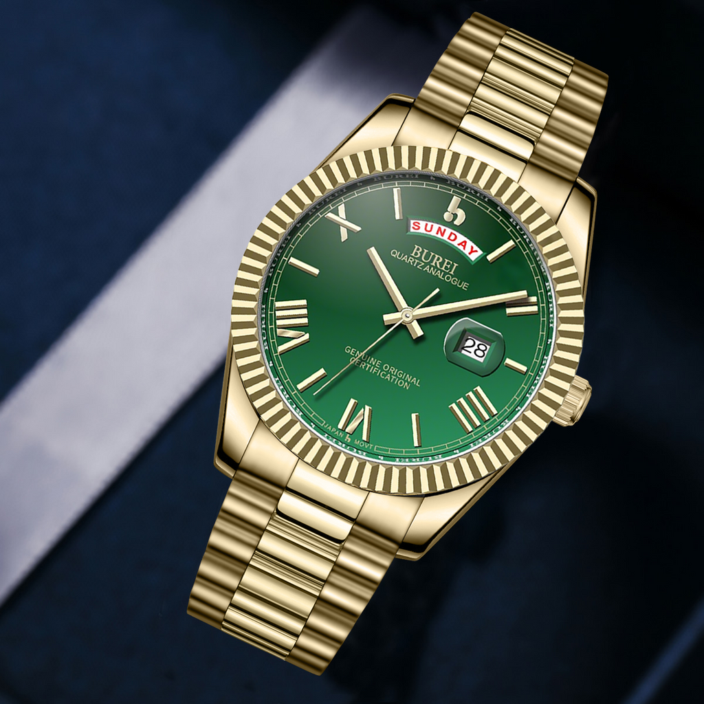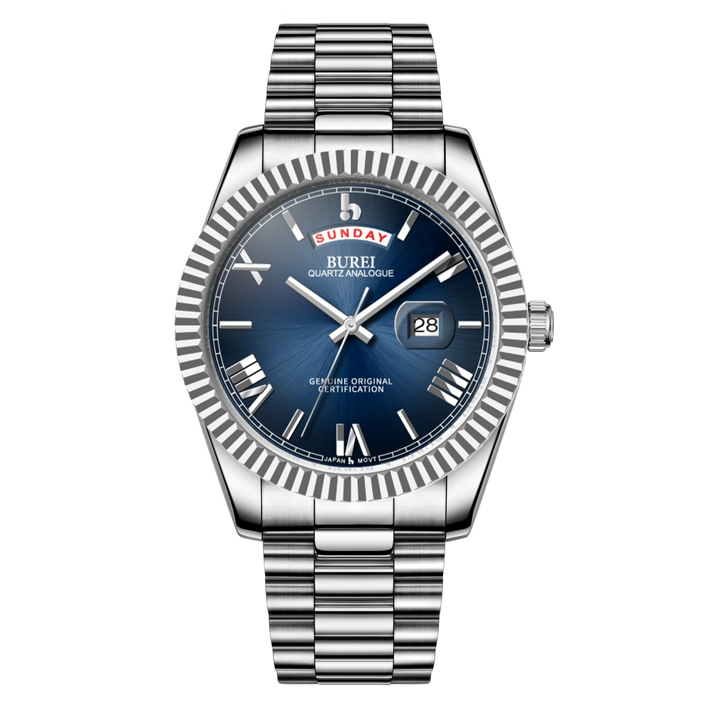 BUREI Mens Luxury Analog Quartz Watches Black Dial Date Display Sapphire Crystal Lens with Two Tones Stainless Steel Band