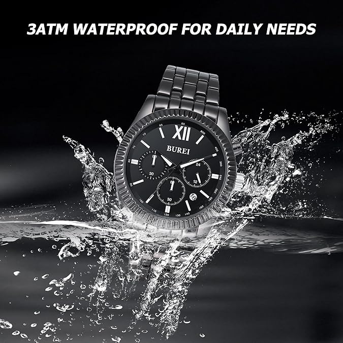 [3ATM WATERPROOF]: Burei waterproof watches for men supports daily use and can withstand daily splash or brief immersion in water. However, It is not suitable for swimming and showering and underwater activities. Long-term contact with water may reduce the service life of the watch